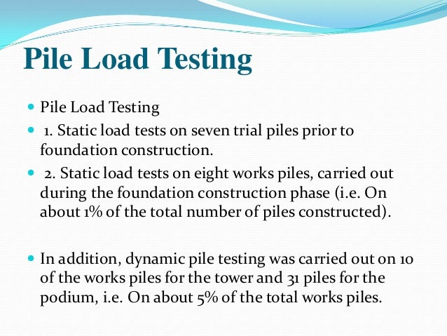 11. 11. Pile Load Testing Pile Load Testing 1. Static load tests on seven trial piles prior to foundation construction. 2. Static load tests on eight works piles, carried out during the foundation construction phase (i.e. On about 1% of the total number of piles constructed). In addition, dynamic pile testing was carried out on 10 of the works piles for the tower and 31 piles for the podium, i.e. On about 5% of the total works piles.
