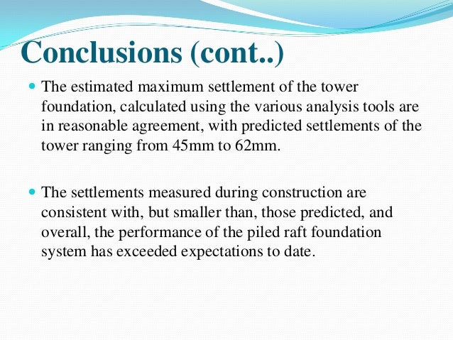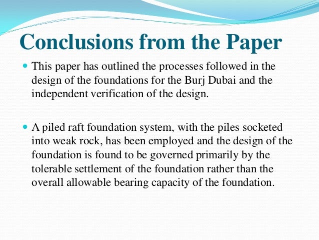 12. 12. Conclusions from the Paper This paper has outlined the processes followed in the design of the foundations for the Burj Dubai and the independent verification of the design. A piled raft foundation system, with the piles socketed into weak rock, has been employed and the design of the foundation is found to be governed primarily by the tolerable settlement of the foundation rather than the overall allowable bearing capacity of the foundation.