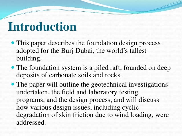 2. 2. Introduction This paper describes the foundation design process adopted for the Burj Dubai, the world’s tallest building. The foundation system is a piled raft, founded on deep deposits of carbonate soils and rocks. The paper will outline the geotechnical investigations undertaken, the field and laboratory testing programs, and the design process, and will discuss how various design issues, including cyclic degradation of skin friction due to wind loading, were addressed.