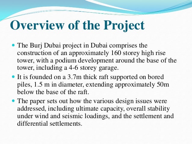 3. 3. Overview of the Project The Burj Dubai project in Dubai comprises the construction of an approximately 160 storey high rise tower, with a podium development around the base of the tower, including a 4-6 storey garage. It is founded on a 3.7m thick raft supported on bored piles, 1.5 m in diameter, extending approximately 50m below the base of the raft. The paper sets out how the various design issues were addressed, including ultimate capacity, overall stability under wind and seismic loadings, and the settlement and differential settlements.