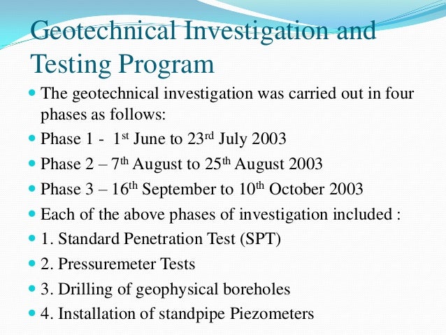 5. 5. Geotechnical Investigation andTesting Program The geotechnical investigation was carried out in four phases as follows: Phase 1 - 1st June to 23rd July 2003 Phase 2 – 7th August to 25th August 2003 Phase 3 – 16th September to 10th October 2003 Each of the above phases of investigation included : 1. Standard Penetration Test (SPT) 2. Pressuremeter Tests 3. Drilling of geophysical boreholes 4. Installation of standpipe Piezometers