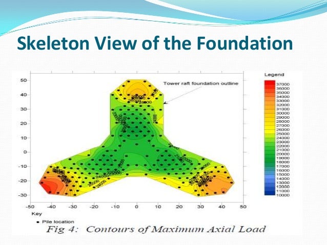 6. 6. Foundation Design An assessment of the foundations for the structure was carried out and it was clear that piled foundations would be appropriate for both the Tower and Podium construction. Tower piles were 1.5m diameter and 47.45m long with the tower raft founded at -7.55mDMD. The podium piles were 0.9m diameter and 30m long with the podium raft being founded at -4.85mDMD. The thickness of the raft was 3.7m. Loading was provided by SOM and comprised 8 load cases including four load cases for wind and four for seismic conditions.