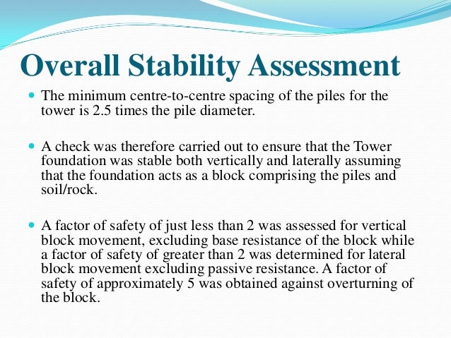 8. 8. Overall Stability Assessment The minimum centre-to-centre spacing of the piles for the tower is 2.5 times the pile diameter. A check was therefore carried out to ensure that the Tower foundation was stable both vertically and laterally assuming that the foundation acts as a block comprising the piles and soil/rock. A factor of safety of just less than 2 was assessed for vertical block movement, excluding base resistance of the block while a factor of safety of greater than 2 was determined for lateral block movement excluding passive resistance. A factor of safety of approximately 5 was obtained against overturning of the block.